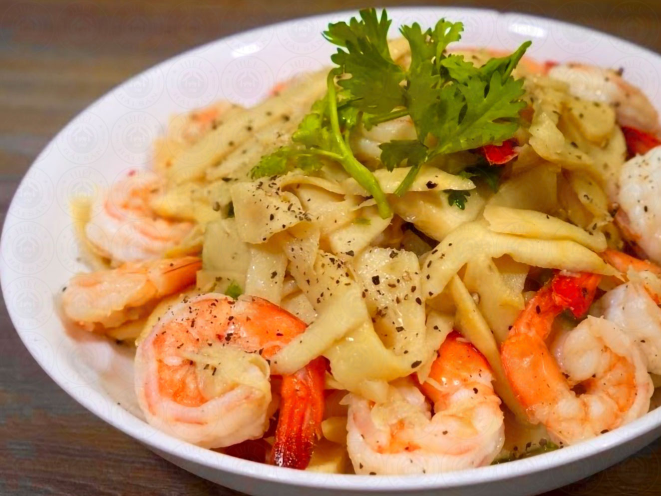 Cuối cùng thêm tiêu, hành lá, hoàn thiện món hải sản đậm đà.